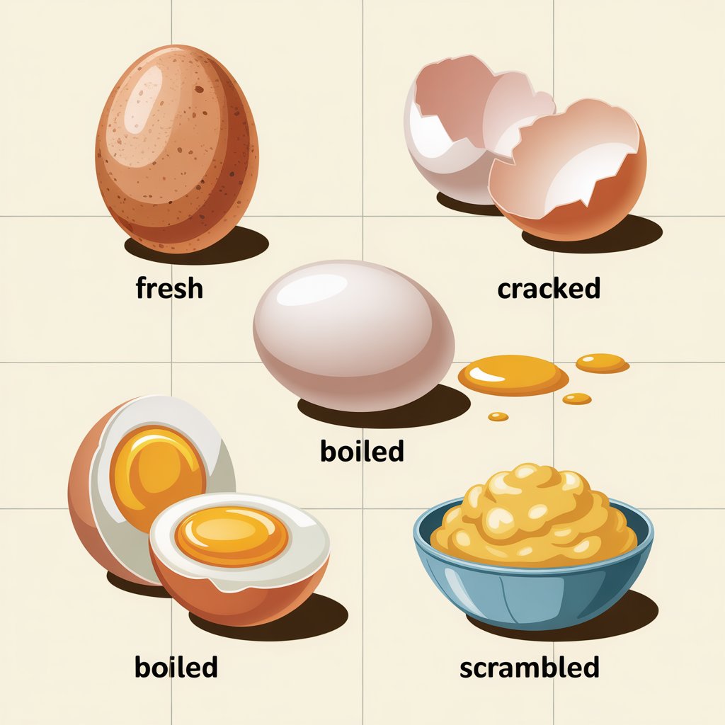 - Cooking: Fried egg, scrambled egg, poached egg.