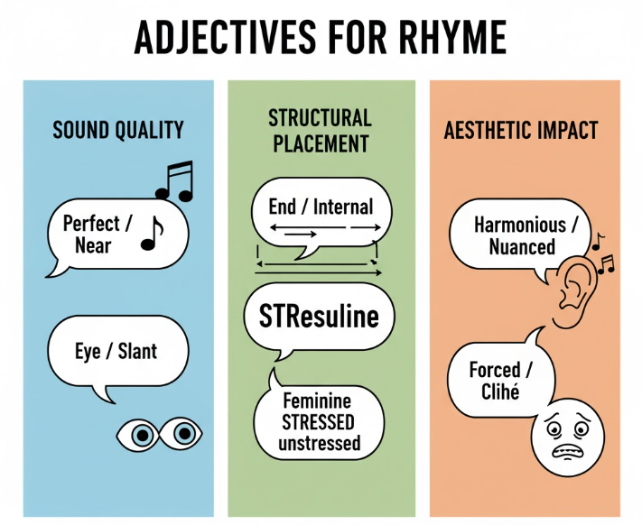 Adjectives for rhyme can be classified based on the type of rhyme they participate in: