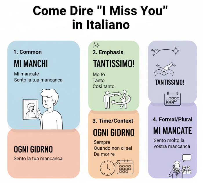 - Are there any other ways to express “I miss you” besides Mi manchi and Mi sei mancato/a?Yes, there are many other ways to express “I miss you,” such as Sento la tua mancanza, Non vedo l’ora di rivederti, and Ho bisogno di te. Explore these options to add variety to your expressions.