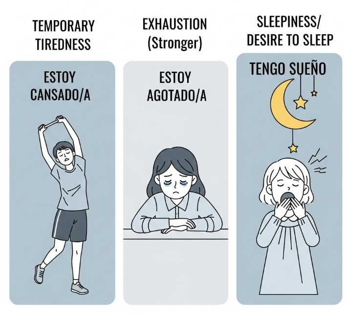 Estar cansado means “to be tired,” indicating a general state of fatigue. Tener sueño means “to be sleepy,” specifically referring to the desire to sleep or feeling drowsy. The former is about overall fatigue, while the latter is about sleepiness.