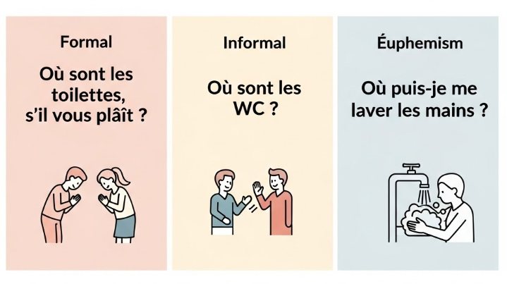 | Où sont les chiottes ? (to a stranger) | Où sont les toilettes, s’il vous plaît ? | Avoid using vulgar language in formal situations. |
