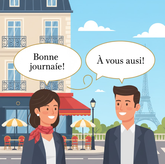 For instance, if someone says “Bonne journée” (Have a good day) to you, the appropriate response in a formal setting would be “À vous aussi” (You too). This phrase conveys respect and politeness.