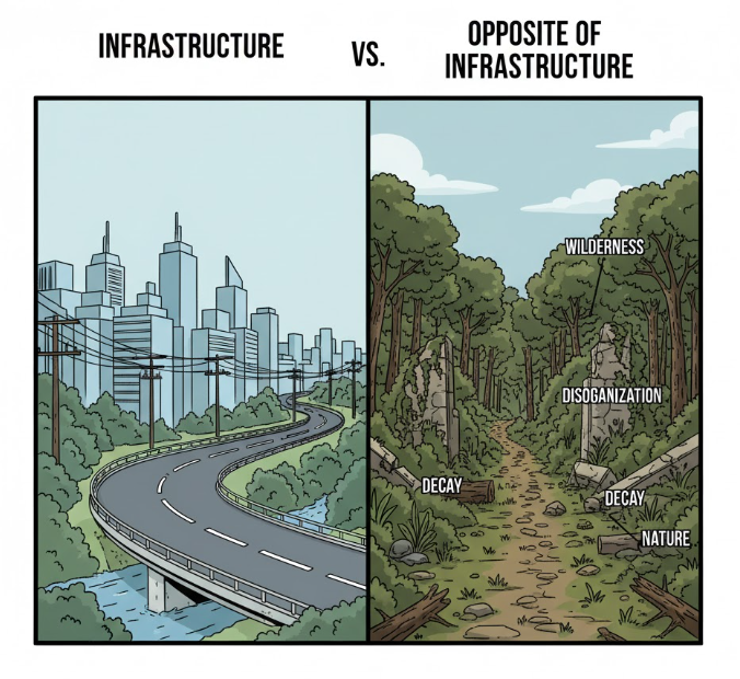 Understanding disorganization as the opposite of infrastructure helps us recognize and address inefficiencies, ultimately promoting better systems and structures.