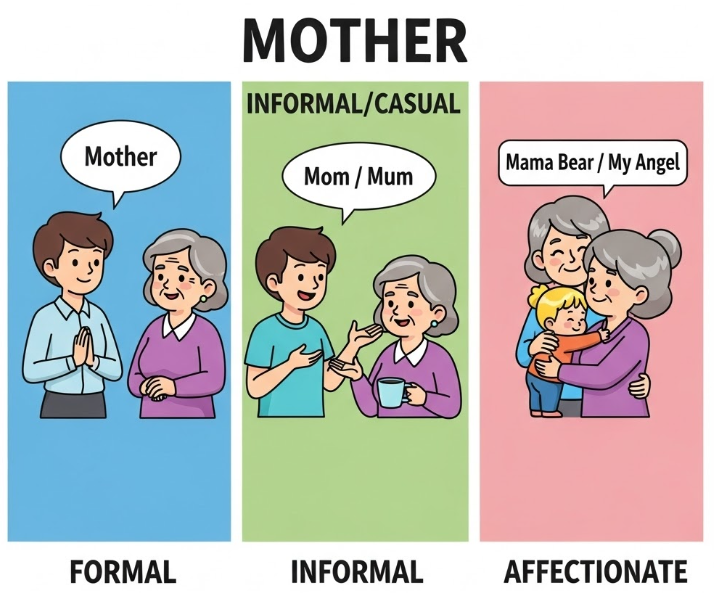 - Informality: Use informal terms like “Mom,” “Mommy,” “Ma,” “Mum,” or “Mummy” among family and close friends.